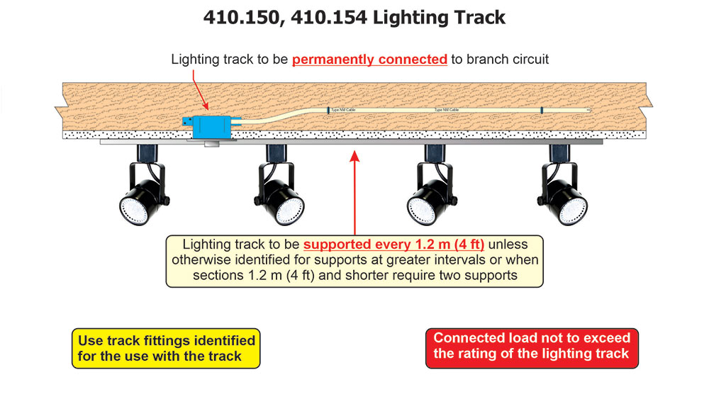 Track lighting (except for dwelling and hotel/motel guestrooms). Add 150 VA for every 2 ft (or fraction) of track to the feeder/service load; for multicircuit track, the load is considered equally divided among the track circuits [220.46(B), Track Lighting]. Note this explicitly on the one-line so it isn’t missed late in design.