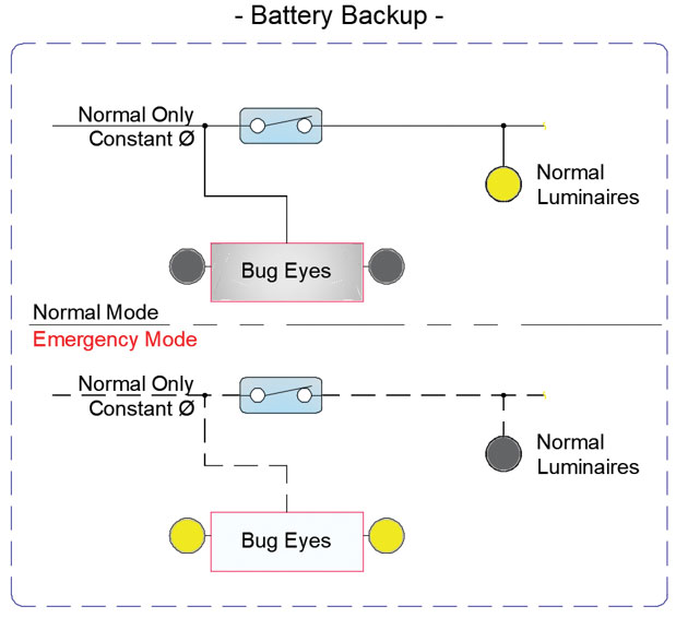 “Bug-eye” units: So nicknamed because of a majority of these luminaires feature two aimable lamp heads, bug-eye luminaires may be installed either as standalone units or integrated with exit signs. A typical unit contains an integral battery and circuitry designed to detect a loss of normal power. When normal power is lost, the unit detects that loss on the constant-charging circuit that keeps the internal battery fully charged. In response, the circuitry automatically switches the battery and turns the lamps on. (See Figure 1.)