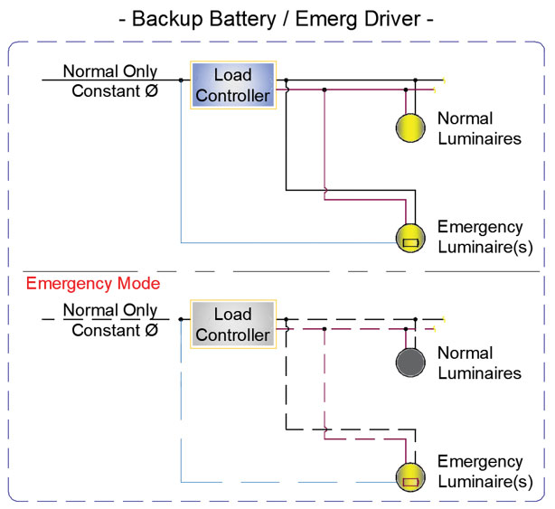 This method eliminates the complexity of powering architectural luminaires from utility power and then switching over to emergency power sources (i.e., generators or central battery inverters) when the normal power sensing detects a loss of normal power.