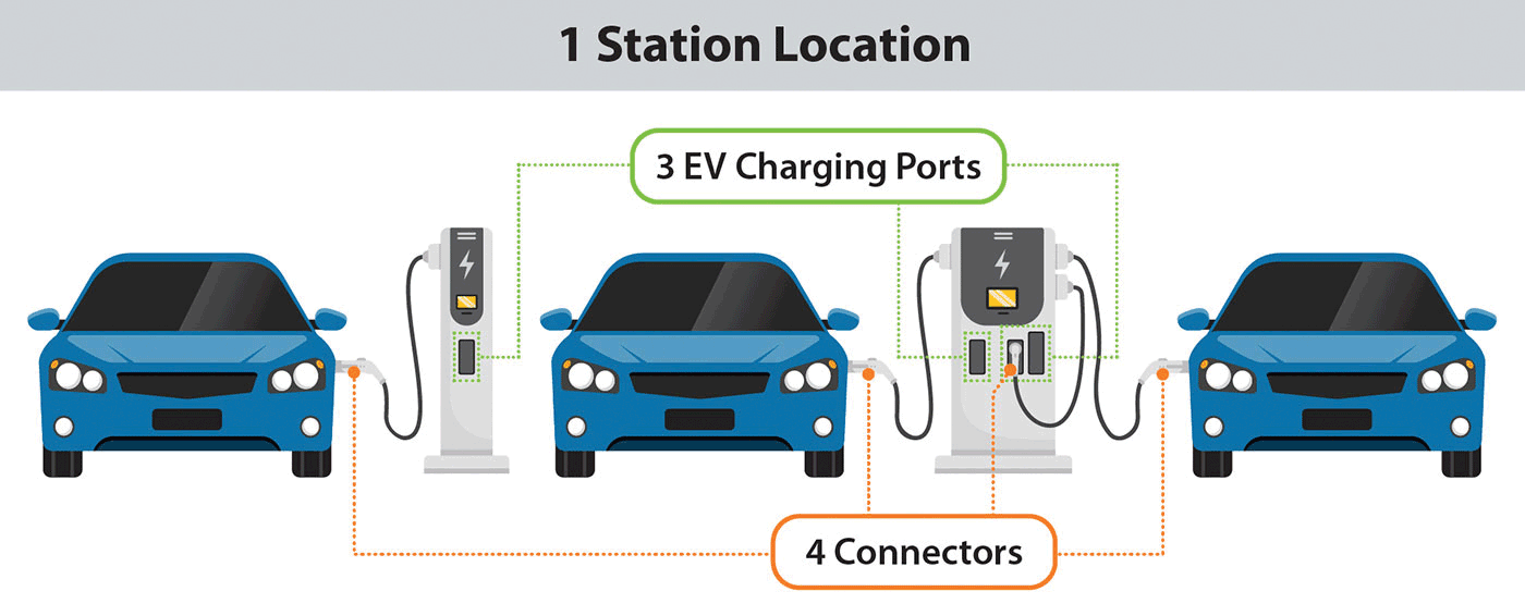- EV Charging Port (also called a charger):An EV charging port provides power to charge only one vehicle at a time even though it may have multiple connectors. The unit that houses EV charging ports is sometimes called a charging post, which can have one or more EV charging ports. EV charging ports are also sometimes referred to as electric vehicle supply equipment (EVSE) ports.