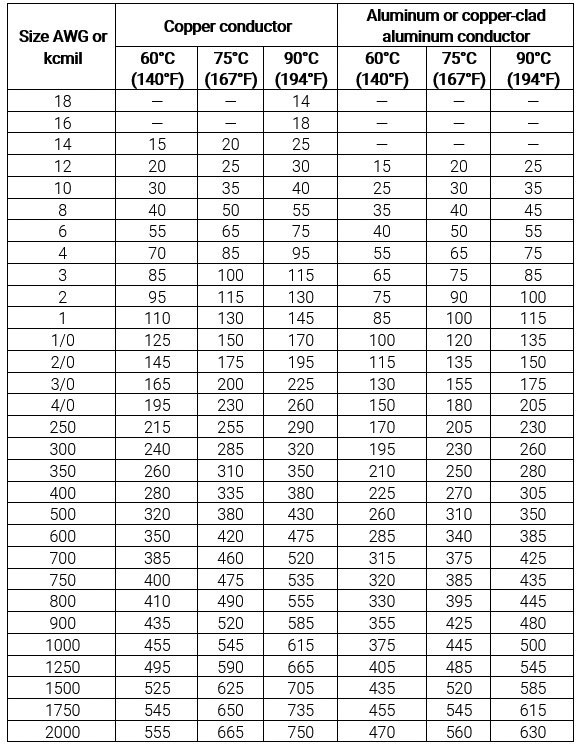 To demonstrate, let’s use a 2 AWG copper conductor with 90°C insulation as an example. Based on the conditions of use as identified in Table 310.16 of the electrical code, a 2 AWG copper conductor with 90°C insulation can carry 130A continuously without damaging itself. If this conductor is in an application that includes conditions of use other than those identified in Table 310.16, these ampacity values must be adjusted. The following demonstrates the proper application of the adjustment and correction factors of 310.15.