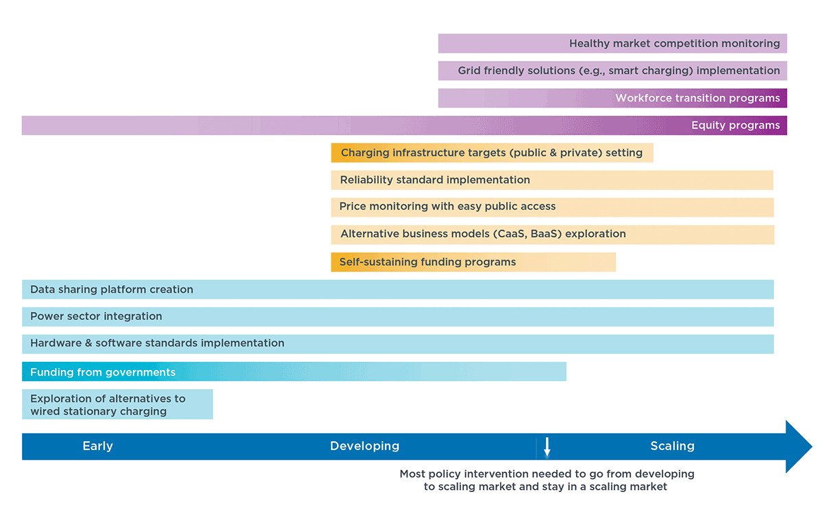 While effective policy implementation necessitates tailoring policy approaches to each transportation mode’s unique requirements, the overarching policy areas remain consistent across vehicle types during each market development phase. Understanding these common policy needs is important for creating efficient and effective charging ecosystems. The subsequent analysis demonstrates how these policy areas manifest differently across early, developing, and scaling market phases, and how implementation strategies can be adapted for distinct vehicle segments.