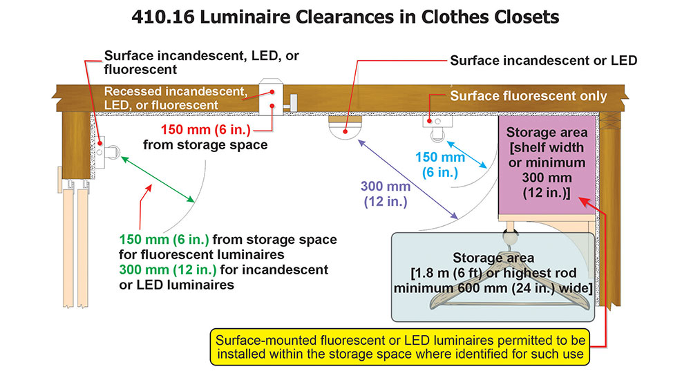 Closets. Clothes-closet spaces remain a common failure point. Section 410.16, Luminaires in Clothes Closets, defines the closet storage space boundaries and limits luminaires by type and clearance from that storage volume; surface-mounted fluorescent/LED luminaires listed as suitable for installation within the closet storage space can be used where labeled, while open lamps and pendants in the storage volume remain prohibited. Inspectors routinely check the product labeling and the measured clearances—don’t rely on “low-heat LED” assumptions without the specific closet suitability listing.