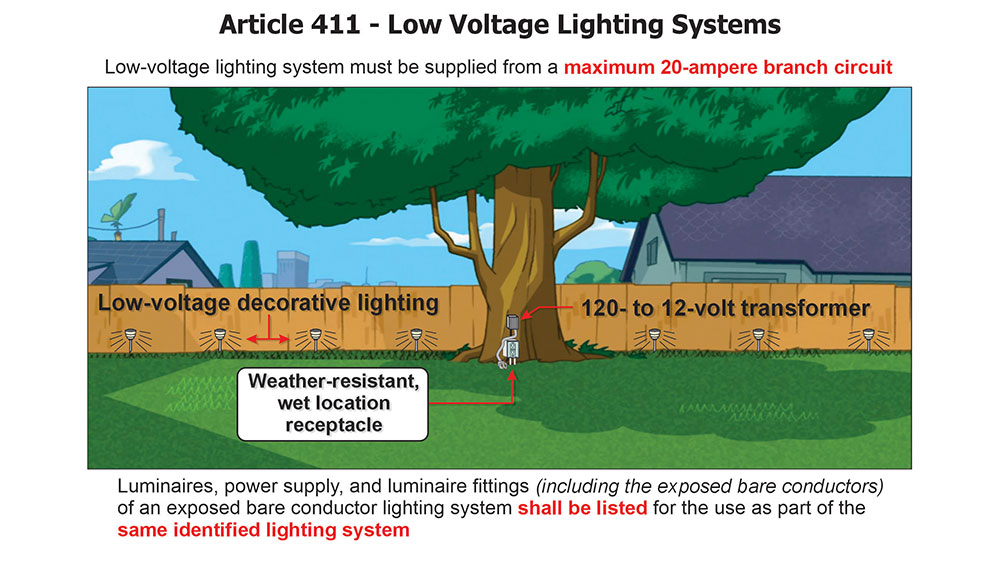 Low-voltage (≤30 V) landscape and accent lighting falls under Article 411, Low-Voltage Lighting, which applies to lighting systems operating at 30 volts or less supplied from a listed low-voltage lighting power unit or a Class 2 source (scope/definitions, Art. 411). Each system must be listed—both the power supply and the luminaires/fittings—and installed in accordance with its listing and instructions [411.3, Voltage Limitations, and 110.3(B), Installation and Use]. On the line (primary) side, treat the wiring like any other branch circuit (Chapter 1–4 methods, overcurrent, boxes, grounding/bonding) [411.4, Low-Voltage Lighting Systems].